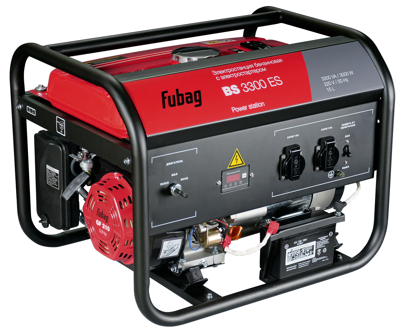 Fubag BS 3300 ES – компактная и экономичная бензиновая электростанция, номинальной мощностью 3.0 кВт. Оптимальное решение для организации аварийного источника электроэнергии на дачном участке. В случае необходимости, обеспечит работу приборов освещения, холодильника, электроплиты или электроинструмента. На бензиновый генератор BS 3300 ES установлен профессиональный OHV-двигатель Fubag и альтернатор с медными обмотками ротора и статора. Электростанция оснащена электростартером с аккумулятором в комплекте. На панели управления установлены две пыле/влагозащищенные розетки 220В/16А. Мультифункциональный цифровой дисплей позволит контролировать основные параметры работы электростанции BS 3300 ES. На электростанции установлена система защиты от перегрузки, короткого замыкания и низкого уровня масла, что позволит увеличить ресурс службы.